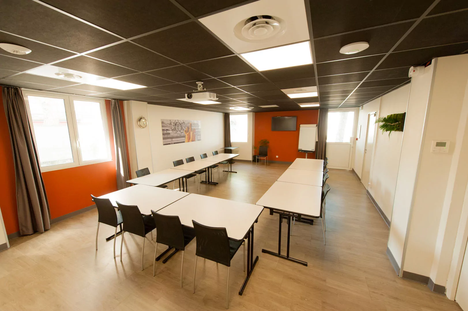 - La salle « comme chez soi » : Un appartement peut vous être réservé, afin d’y organiser une réunion de 12 personnes maximum, dans une ambiance plus chaleureuse. Équipée d’un vidéo projecteur, cette suite possède également un espace bar, un coin canapé, une table et des chaises classiques.